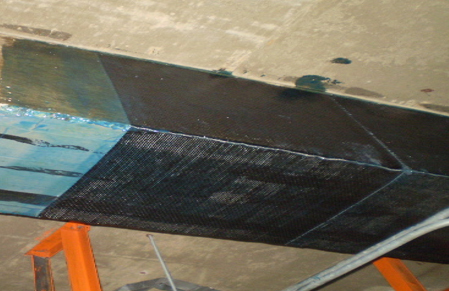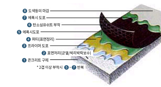보강을 요하는 기존 철근콘크리트 구조물의 슬래브 밑면, 보의 밑면과 측면 등에 탄소섬유쉬트를 에폭시수지로 함침적층(含浸積層)하여 기존 구조물에 접착 일체화시키는 보강공법.
